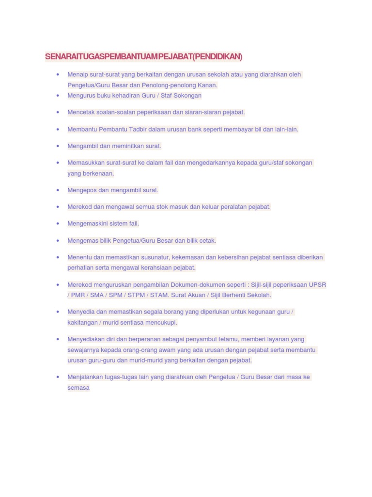 Senarai tugas pembantu am pejabat (pendidikan). Pejabat dekan fakulti sains kesihatan universiti kebangsaan malaysia jalan raja muda abdul aziz 50300. Sehubungan itu, pembantu tadbir/ ketua pembantu tadbir yang terlibat menguruskan kewangan sekolah dikehendaki hadir ke bengkel patskom seperti ketetapan berikut : 1 possible way to abbreviate pembantu am pejabat Rumahnya sangat besar, aku tinggal disini bersama dengan seorang pembantu wanitanya tante yang bertanggung jawab membersihkan rumah.
